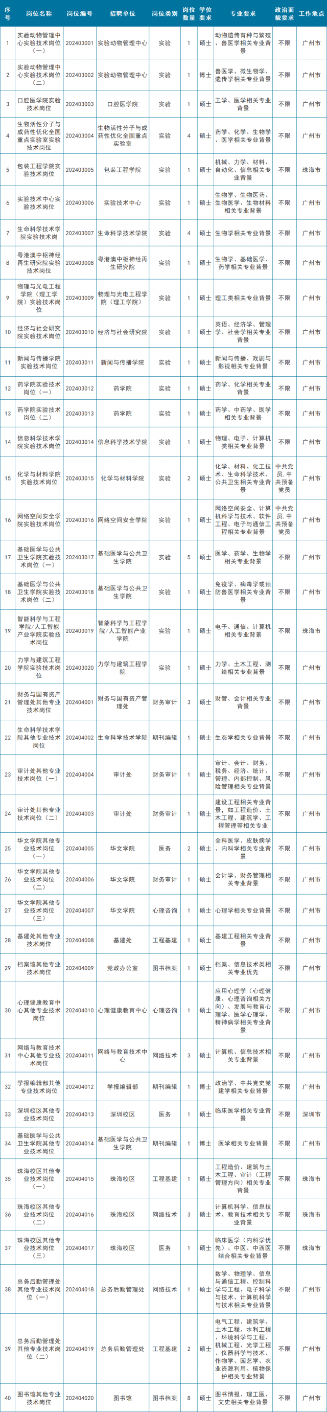 详细岗位信息见暨南大学招聘网和附件,每名应聘者只可选报1个岗位。